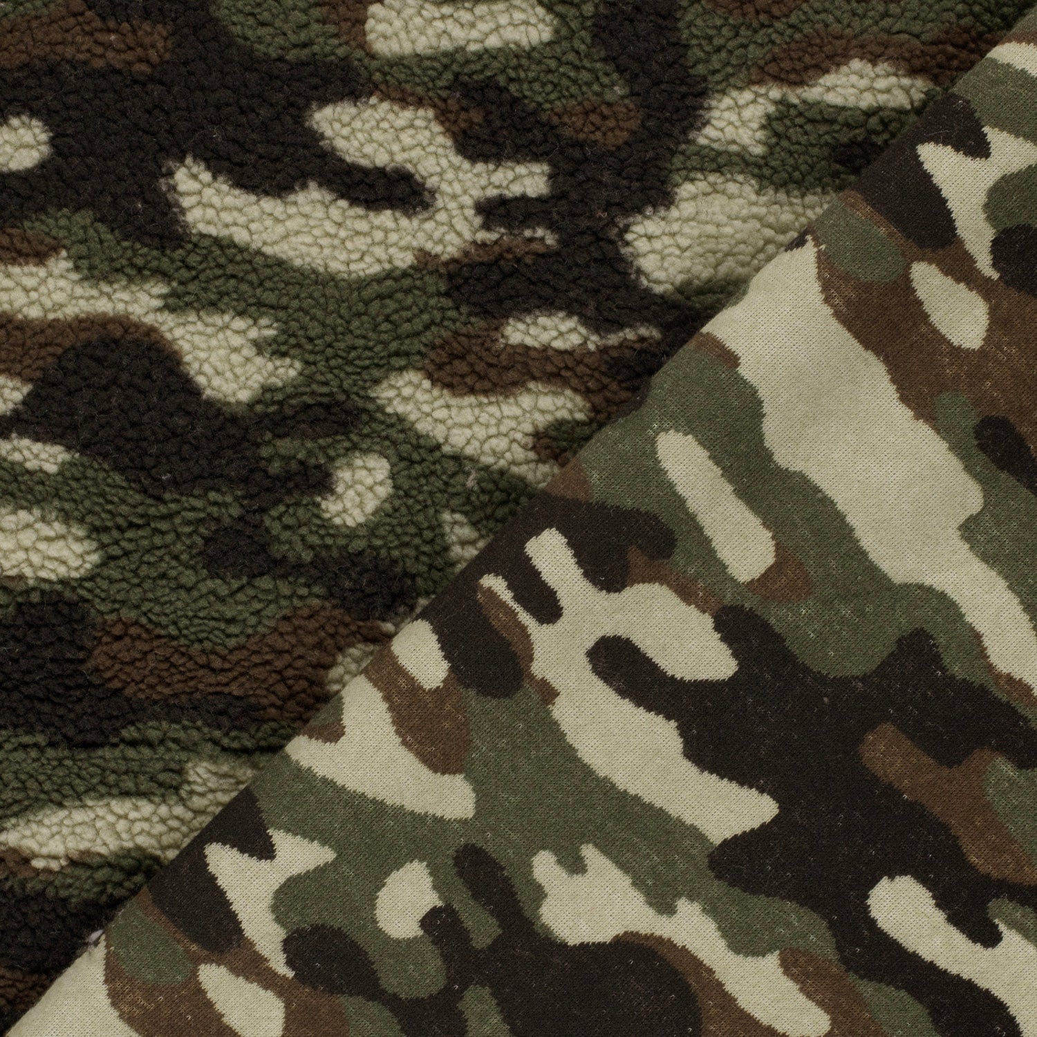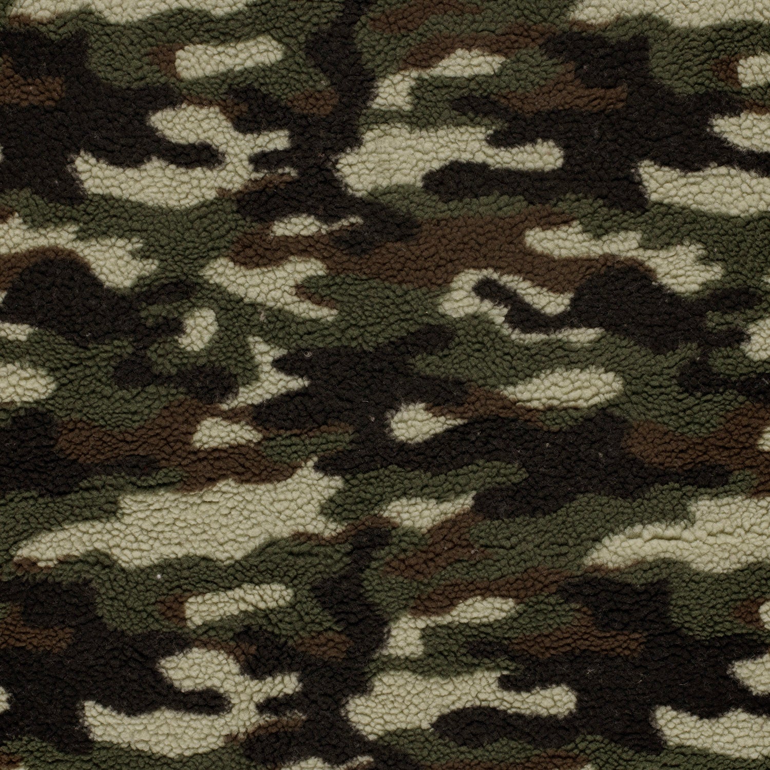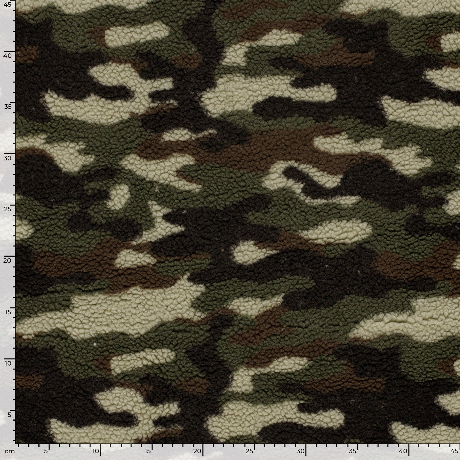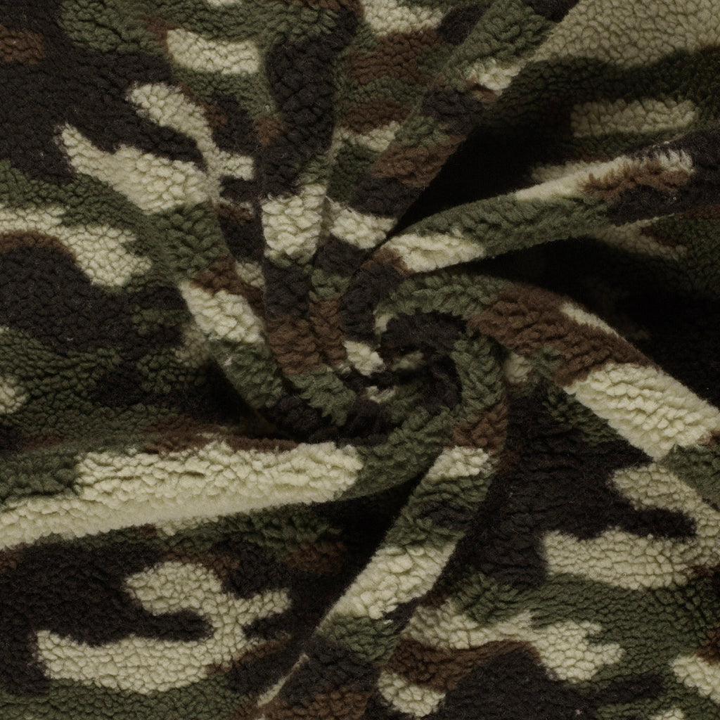 Hochwertiger Sherpa-Fleece mit charaktervollem Camouflage-Jacquard-Muster in Khaki und Grün. Dieser luxuriös weiche Teddystoff bietet außergewöhnliche Wärmeisolation und angenehmen Tragekomfort für die kältere Jahreszeit. Die robuste Verarbeitung und das zeitlose Tarndesign in Olivgrün, Schwarz, Braun und Sand machen ihn zur idealen Wahl für hochwertige Pullover, Jacken, Mäntel und Heimtextilien. Perfekt für anspruchsvolle Näherinnen und Näher, die Qualität und Stil vereinen möchten.
